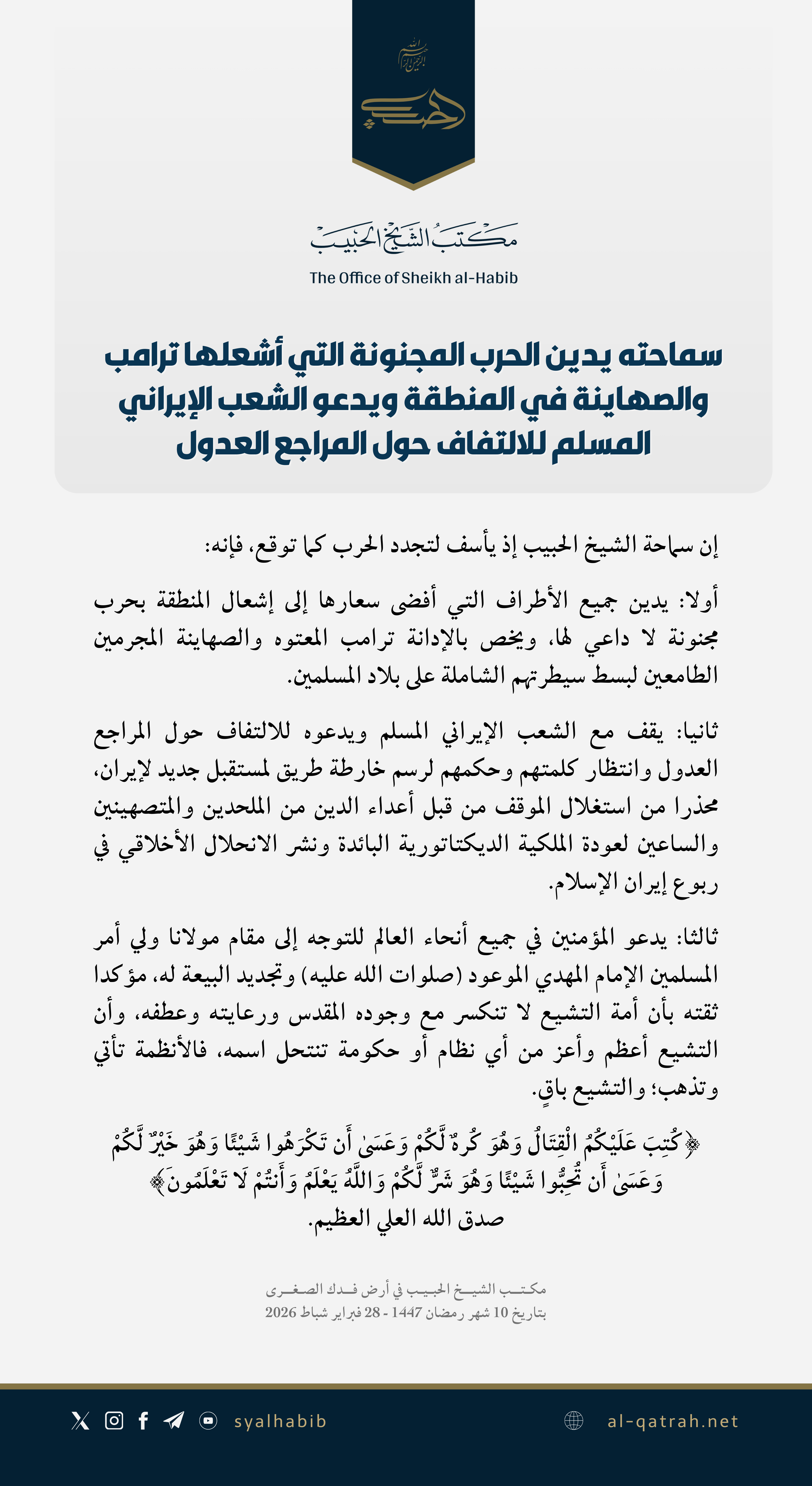 أولا: يدين جميع الأطراف التي أفضى سعارها إلى إشعال المنطقة بحرب مجنونة لا داعي لها، ويخص بالإدانة ترامب المعتوه والصهاينة المجرمين الطامعين لبسط سيطرتهم الشاملة على بلاد المسلمين.